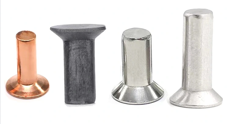 皿リベットは頭とシャンクから構成されます。ヘッドは上部が平らな円錐形で、あらかじめ開けられた皿穴にフィットするように設計されています。シャンクは円筒形で、リベット締め中にその端が変形して固定頭部を形成します。一般的な材料には、アルミニウム合金、炭素鋼、ステンレス鋼などがあります。