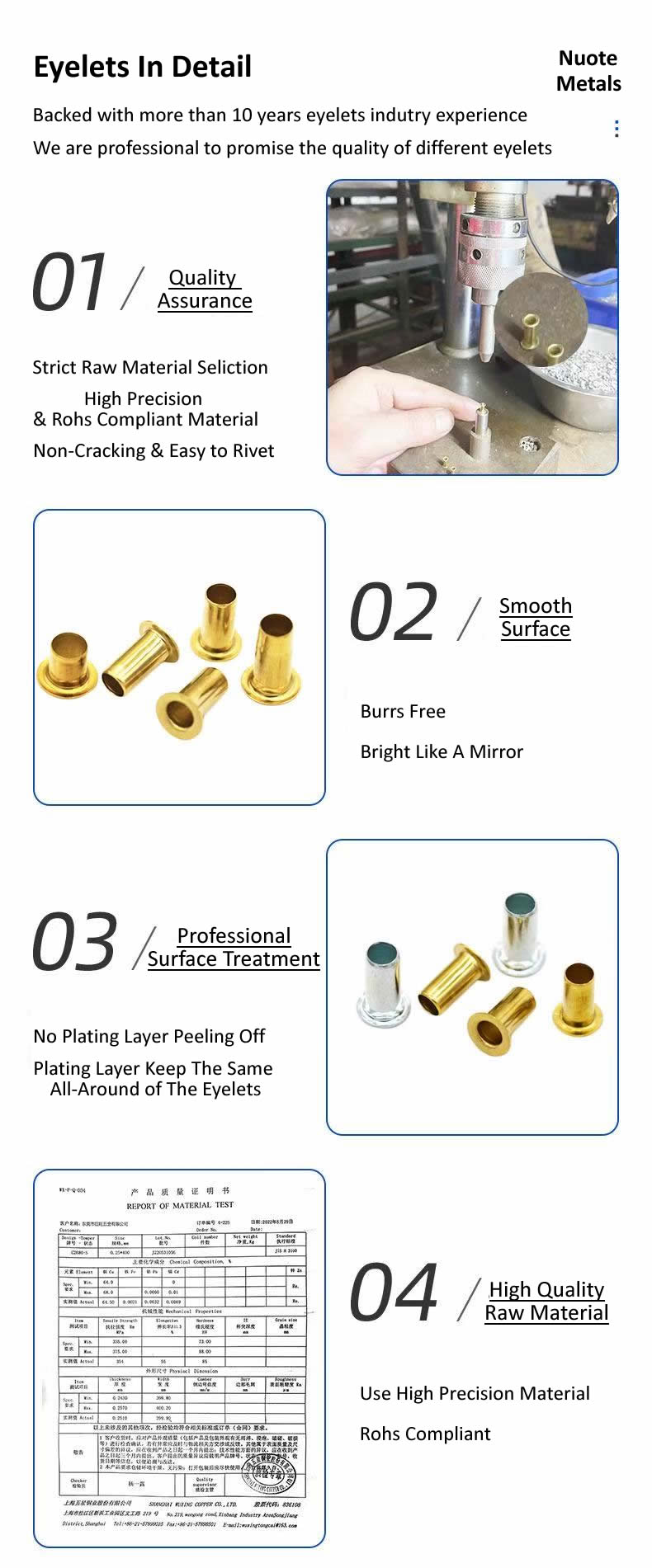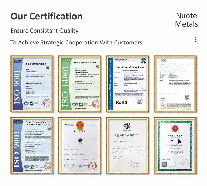 A: Nuote Metals は、必要に応じてサードパーティのテストレポートとともに、RoHS、REACH、およびその他の準拠宣言を提供できます。