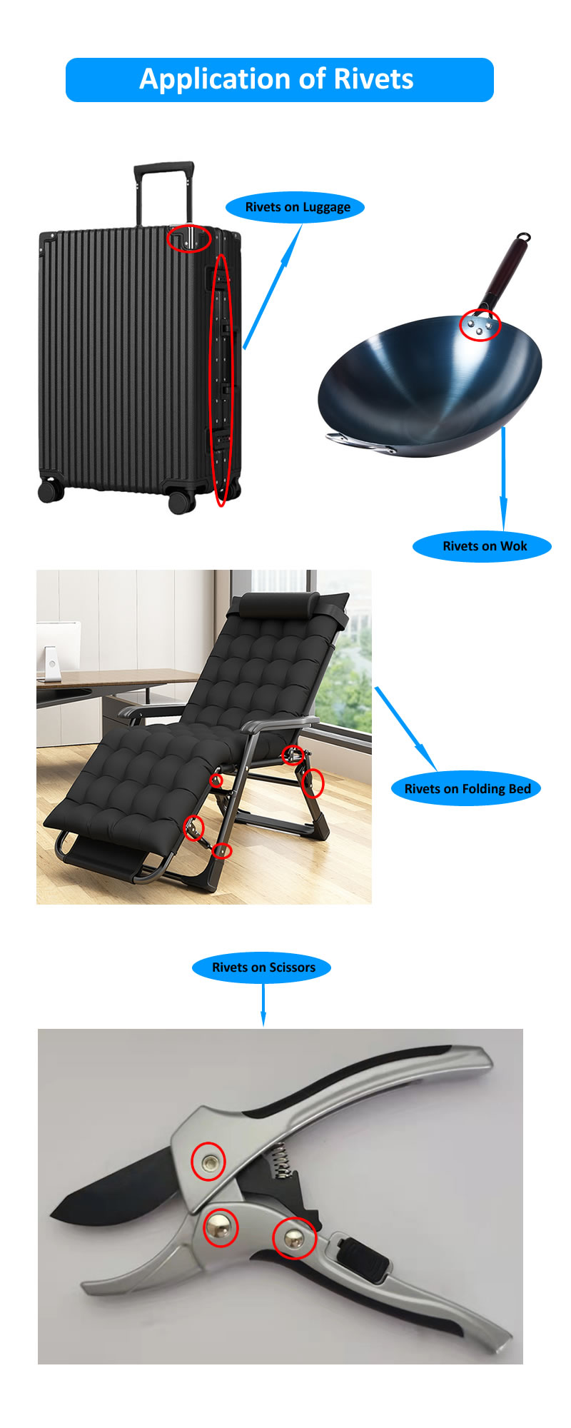 リベットはさまざまなケースに適用できますが、ここでは既存のお客様の製品の取り付け事例の一部を示します。